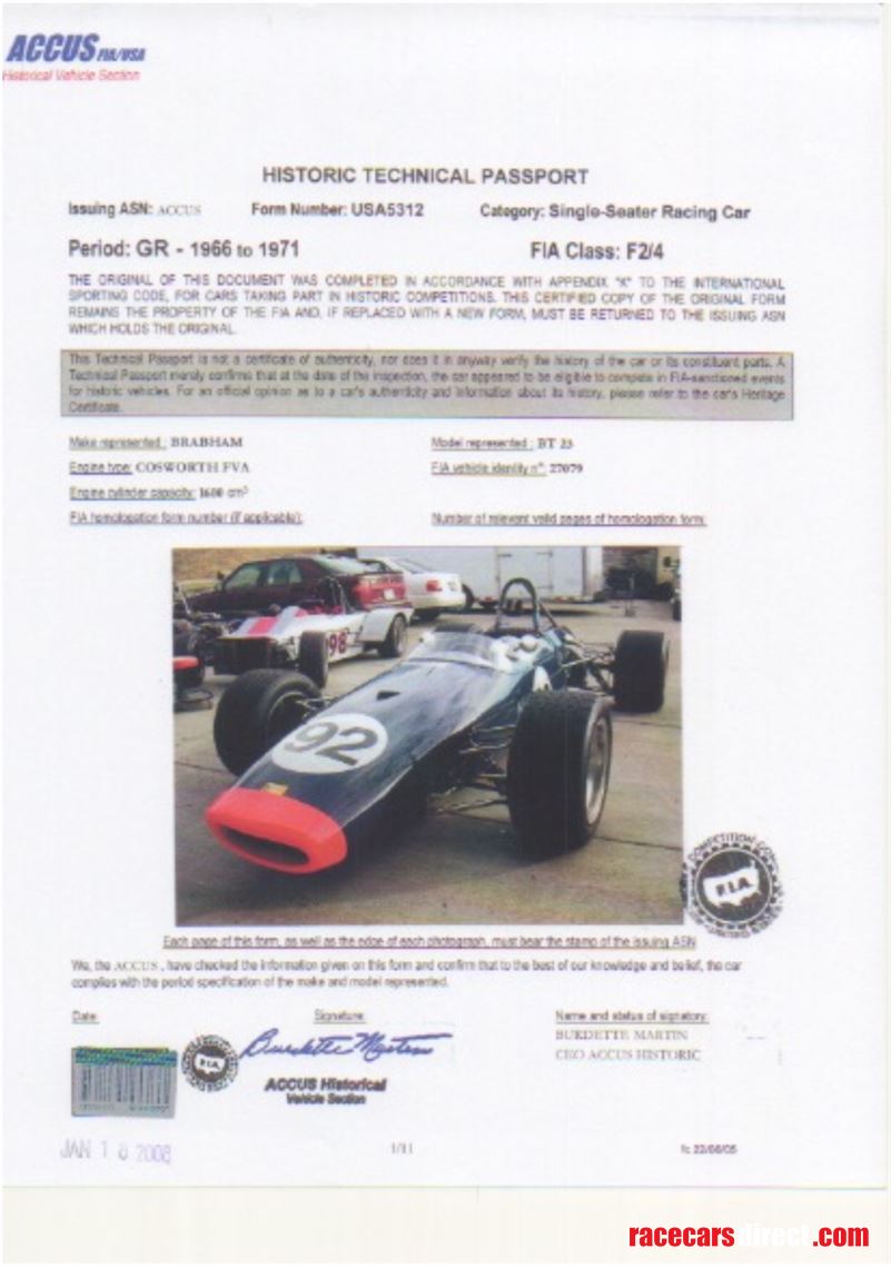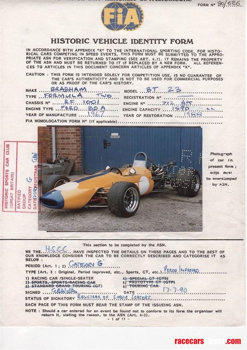 All historic racing cars have a history that can be lost in time. In 1992 I originally purchased this car in the UK with Chassis plate BT23-6 and with a frame stamping RF1001 I have diligently researched and recorded the above history with great help from the Brabham archives.