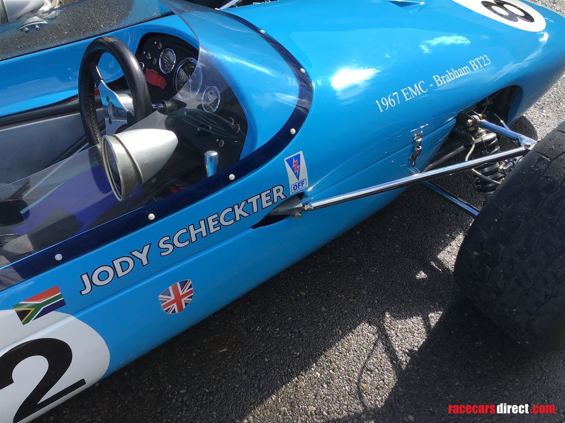 Also worth mentioning here is the 1968 EMC F3 car which was built along very similar lines to a Brabham BT23. During the 1970s it was used in Monoposto Formula and after racing under a variety of names, it was (mis)identified as a Brabham some time in the early 1980s. It was restored to BT23 specification when owned by Jay Galpin in the mid-1990s, after which it was owned by Barry Marquardt, Bob Baker and, since 2006, David Jacobs. As of 2011, David was planning to restore the car to its original EMC specification. In September 2018, Jacobs sold it back to Jay Galpin (Litchfield, CT), and it has been fully restored by David Irwin to full BT23 Formula 2 specification with Cosworth FVA engine and Hewland FT200 gearbox.