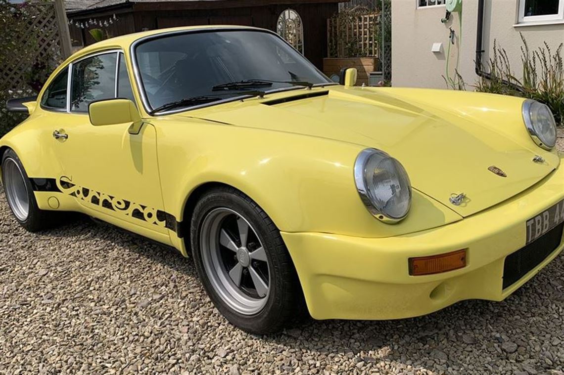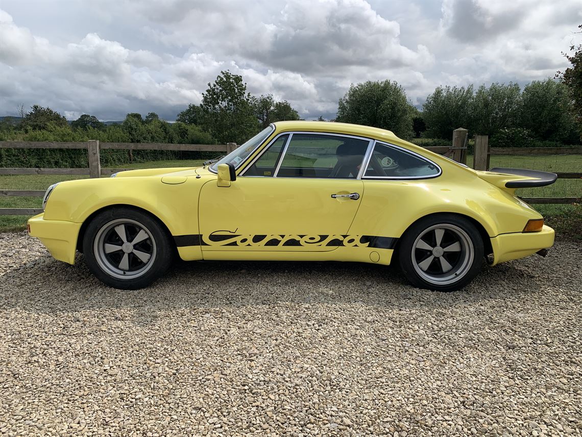 Freshly painted in Porsche Light Yellow a 1969 Tax & MOT exempt LHD 3.0 RS Homage with all steel flared arches non sunroof. Has a 2.7 Litre engine on Webber carbs and 915 gearbox. Super rare 3 piece split rim Fuch style alloy wheels made by Compomotive for Dage Sport Porsche 8"front & 11"rear. Front strut brace and front mounted oil cooler. New rear Koni shocks ARB's both powder coated. Suspension all painted & poly bushed new rear drop links. New rear brake calipers & fronts refurbished (as new) all painted matt black to match. New Momo steering wheel and Cobra RSR bucket seats with cord centres & mactching head rests and Willans Harnesses. Full cage (1/2 currenlty fitted). Comes with some original carpet sections and all rear seats and panels plus RS Door Cards. Super little car offered at a fraction of build cost.