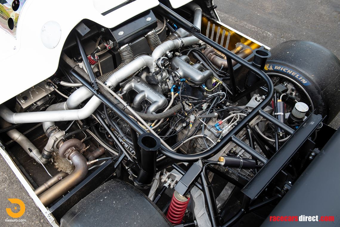 The engine is a twin-plug 3.0-liter air-cooled Porsche flat-6 built by Gary Meier of Torque Power Engines in Reno, Nevada. It utilizes Motec M130 engine management system fed via dual fuel pumps drawing from an aluminum fuel cell. Twin Garrett turbochargers breath through a 3.2-liter Carrera intake plenum, and the throttle is drive-by-wire, utilizing a 997 throttle body. The dry-sump lubrication system has a baffled aluminum oil tank and competition-spec plumbing to and from the engine and oil coolers. Although no dyno sheets are available, the engine is reportedly capable of 600hp, depending on boost settings, but is currently set to generate approximately 500hp running race fuel.
