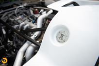 The final build, completed under current ownership, proceeded with the integration of numerous factory 962 Porsche parts including front hubs, A-arms, shock absorbers, a complete pedal cluster, steering column, body support tubing, factory 962 tail lamps, door and body latches, and flat bottom front belly pans. Additional mechanical features further incorporated into this remarkable build include a Redline (Fabcar) rear wing, correctly sized radiators and coolers, 8-piston front caliper Brembo ventilated disc brakes (with bias control) sourced from a factory Audi race car. Additional features include Porsche 996 Twin-Turbo S rear disc brakes, 993 Super Cup rear suspension with factory upgrades, and an inverted 930 Porsche transaxle with cooler and limited-slip differential. Though it involved challenging package engineering, the inverted gearbox delivers a much lower overall vehicle center of gravity, more favorable drive shaft angularity, and greater CV joint range, all of which contributes to improved performance and mechanical endurance.