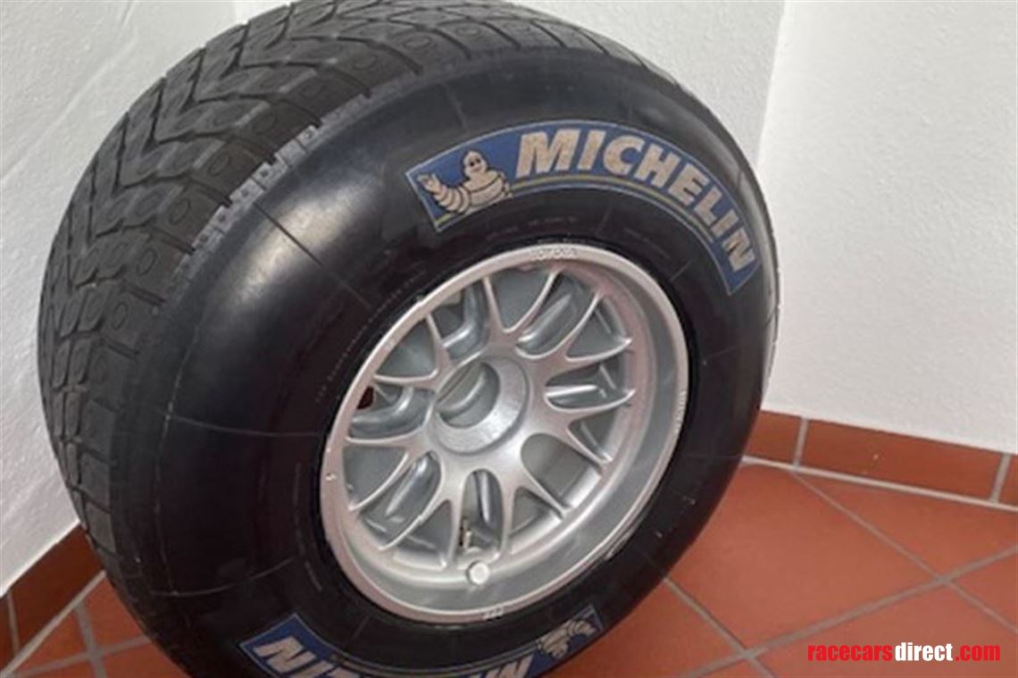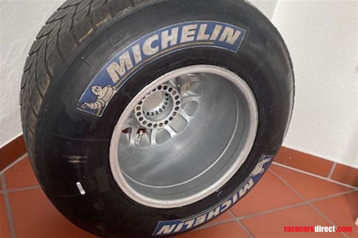 I'm offering a Toyota F1 front wheel. It consitzt of a Michelin wet tyre and a BBS rim. The tyre sems not to be used. Due to it's age it is a bit brittle, but it still keeps the pressure. The rim was has an new paint coat.
