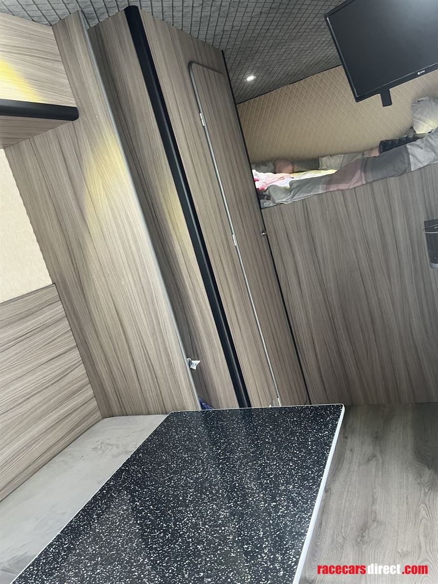 Full living area with fixed double bed, shower, toilet, kitchen, l shaped seating with removable table, Tv , and heating.