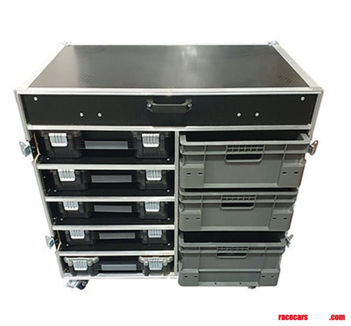 To each side of the tool box are a column of euro containers with a parts storage box at the top.