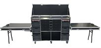 The front covers are removable and are supplied with table legs inside so that they can be attached to each side of the case as side tables. Creating an extra large working area from the case foot print.