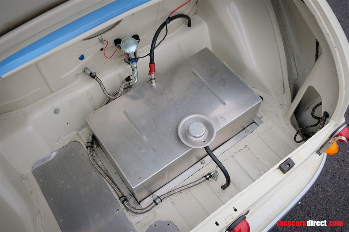 Bodywork wise, the car was acid-dipped, lightened and strengthened and features steel front wings, doors, bonnet and boot lid to comply with FIA regulations. The car was painted in Old English White with Iris Blue roof. The car is fitted with a 6 point roll cage with bulkhead cross brake, door and harness bars, as well as recessed inner wings to improve airflow to the carburettors. The rear wings are widened to accommodate the wider rear track.