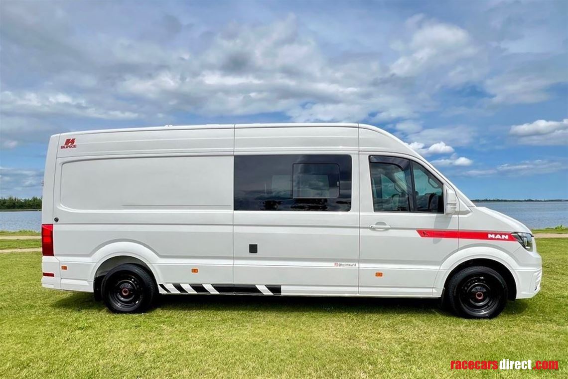 Man Camper 2020 (July) man van 3.5T TGE one owner van from new with service history. Camper construction was done in June 2024 in the uk costing over costing £30,000 It was designed for racing it has a workshop at the rear for a kart and all tools and equipment required. It also has a tow bar to tow a race car and can come with this new Brian James trialer if needed ( €6,500 ) Van sleeps 4 people with ease and has been converted to the best possible standard with absolutely no shortcuts! Full kitchen with 2 gas ring cooker, sink, oven and grill! Kitted out with solar panels so off grid/ track side for days is no issue. TV and lighting all top quality. Night heater and insulation make sleeping out a joy. Van is top spec with rear air suspension, turning front seats, leather steering wheel apple car play really make for a nice driving van. Also has a map with more power and torque. Sold with full service, new timing belt, new MOT ready to go for new owner.