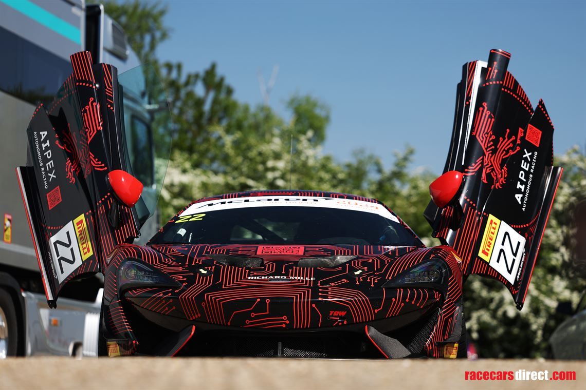 - This example is finished in a red and black vinyl wrapped livery, with a McLaren Trophy windscreen strip and ‘22’ entry numbers, the driver names ‘Oliver Webb’ and ‘Ryan James’, red door mirror caps and rear wing finishers, various exposed carbon-fibre parts, and decals from Aipex Autonomous Racing, Pirelli, and Richard Mille.