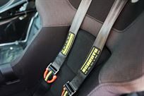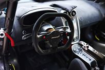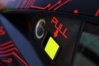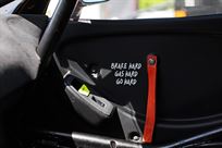 - The purposeful interior houses a single black cloth-trimmed bucket seat with a Schroth six-point safety harness, a grey Alcantara-trimmed dashboard with contrast stitching, carbon-fibre trims and exposed tub, and lightweight red door pulls.
