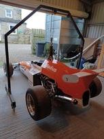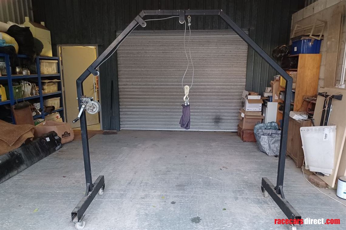 Gantry for manually lifting engines or light racing cars. Has been used for historic Formula 2, Formula 3, FF2000, BDG and Pintos