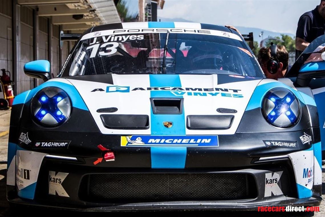 Porsche 992 GT3 Cup MY2023 racing car with ABS and TC from private driver with no accidents for sale in perfect condition, with 52 hours and 8600 km of engine life. Maintained by Baporo Motorsport and ready to race.