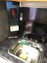 The box has pull out steps to a living area with toilet, shower, hot and cold running water, microwave, TV, remote control heating /ac, sofa converts to a single bed,