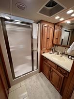 This particular Winnebago Tour was build for the UK market with items such as gas hob and dual fridge/freezer, something that seems so small makes a huge difference when using this RV. The huge L shape sofa, reclining chair and captains chairs makes this lounge area very sociable and spacious. The kitchen is a real highlight on the 42QD as the storage is unbelievable with pull out worktops making meal preparations effortless. The half bath in the centre of the coach is perfect for guests leaving the large bedroom suite and rear bathroom private.