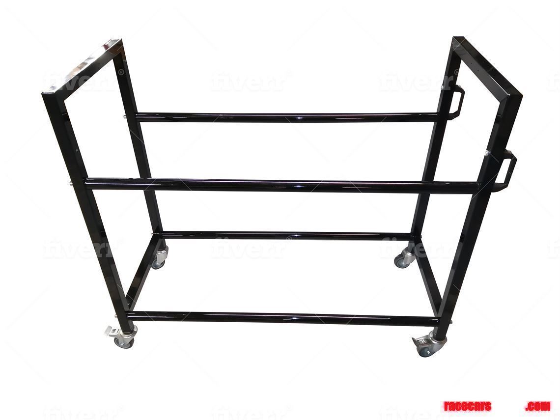 Tyre rack: Fully TIG welded tyre racks, powder coated black featuring four swivel castor wheels.
