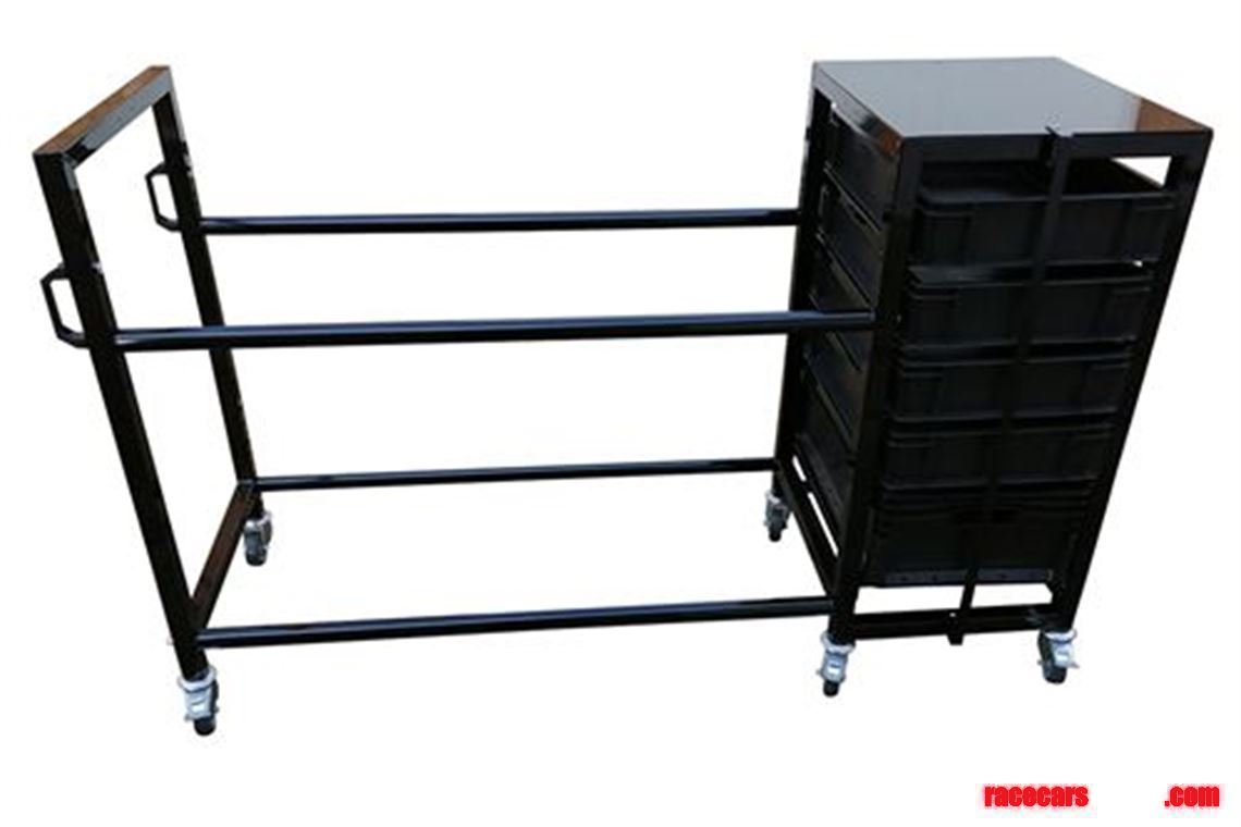 Tyre rack with removable storage boxes: Tyres up to 700mms in diameter, with two handles on one end. Carrying five removable storage boxes, 4 x 120Hx600Dx400W and 1 x 220Hx600Dx400W mms.