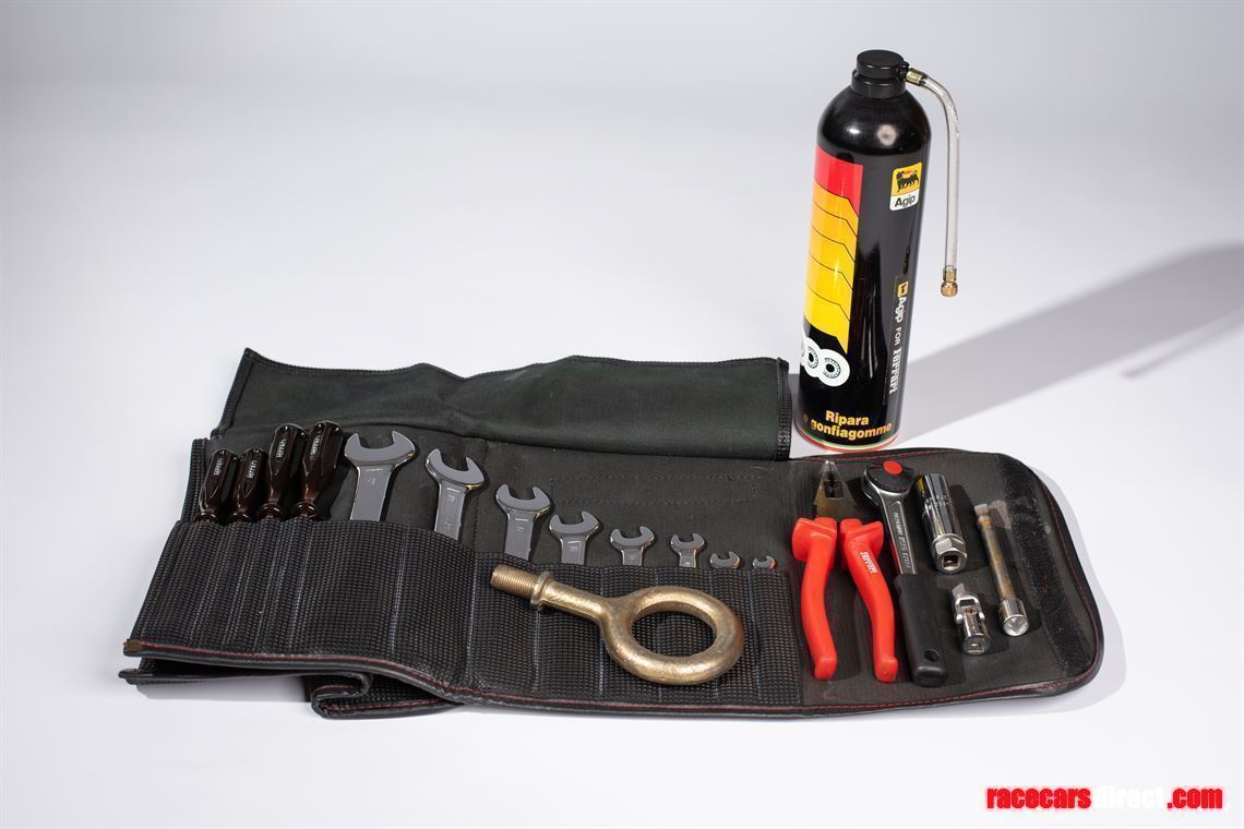 Very rare and extremely well presented Ferrari F40 Tool Kit & Agip Tyre Inflator, to include tool bag, 4 x screwdrives, 8 x spanners, complete set of wenches, pliers & tow hook eye. Original OEM, these toolkits are becoming increasingly difficult to find. POA
