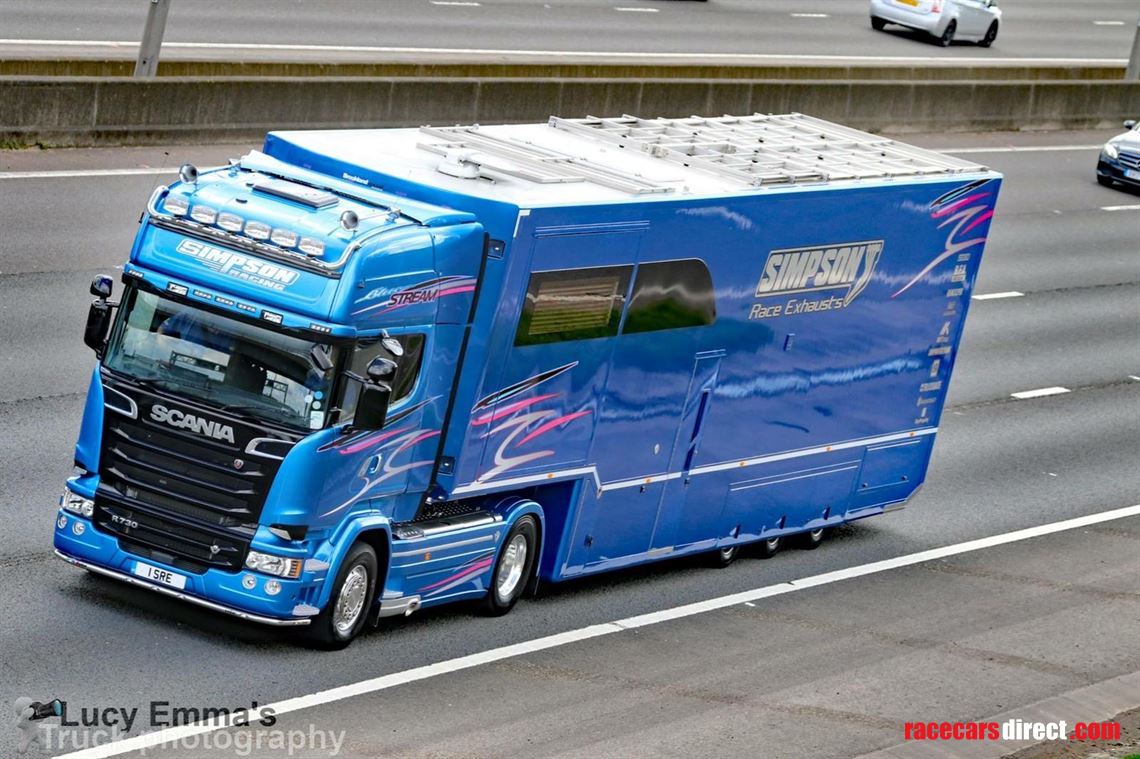 Brookland ultra low race trailer. Full luxury high spec trailer including: Full spec office with flat floor slide outs, leather seating, air con etc. bathroom, small double bedroom, internal staircase to exterior roof gallery. Side access to double floored race deck which includes engineers area, hospitality and small kitchen. Rear luxury lower deck. Carrying capacity for 2 x GT to rally cars, equipment and awning.