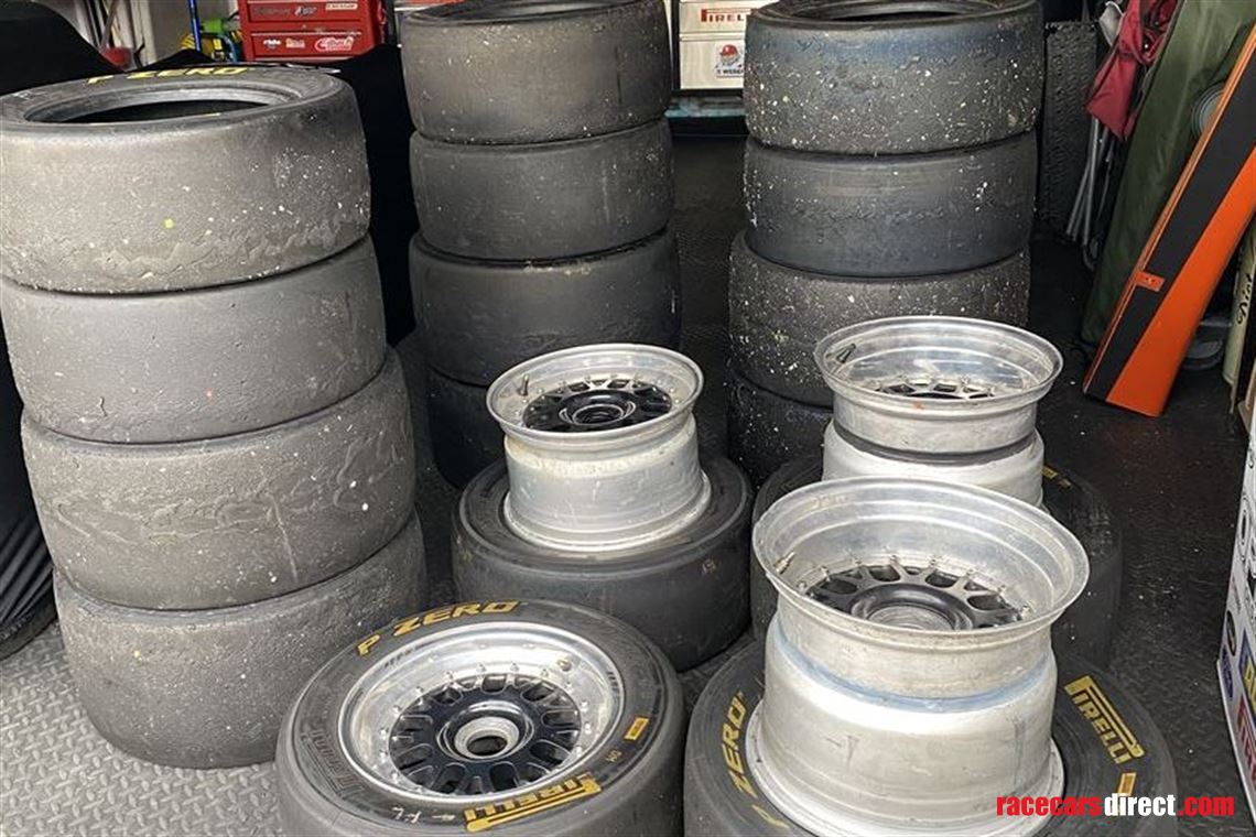 13 inch rims with centre hub - 7.5 wide front and 10 wide rear. Rims are used and have a few scratches and dents as would be expected. 4 sets of slick Tyres are all used.