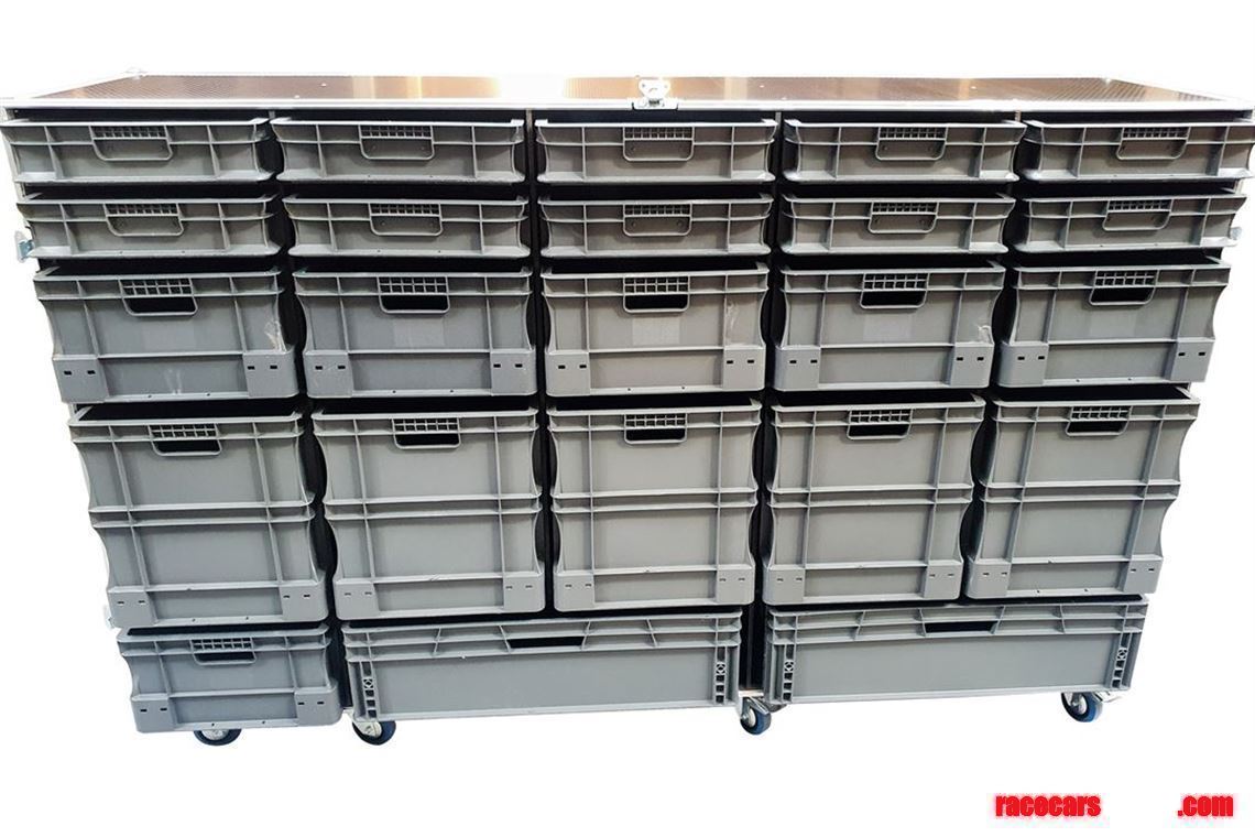 Extra large flight case with 23 removable euro container boxes.