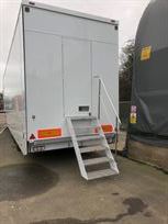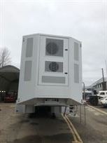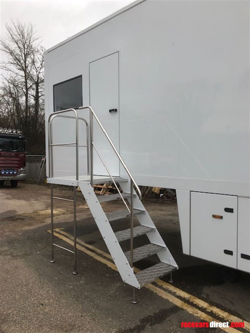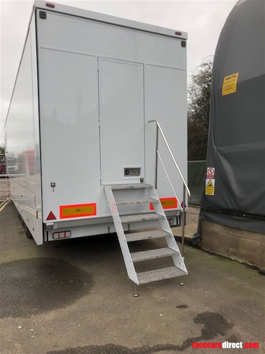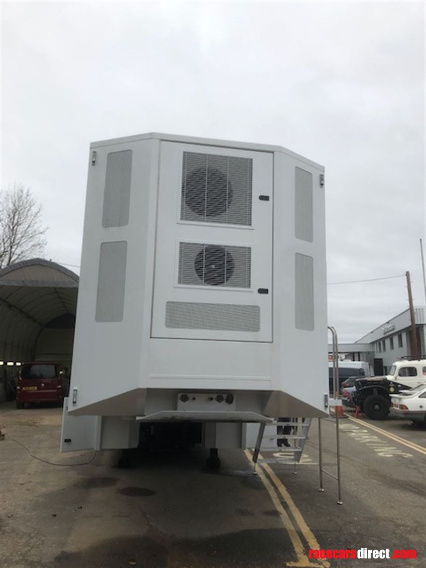 Rebuilt race trailer for sale. Straight axle; Tri-axle super singles; New front end; Brand new D'hollandia 3 tonne car lift at rear; Side and rear doors in tail lift have steps, platform and handrails; New front nose cone with brand new air conditioning; Bottom of trailer has new belly lockers fitted; 27 kva generator; Full electrics fitted; Gas strut doors; 3m fully trimmed office with windows, TV, bottle fridge, microwave and air con; Currently fitted to carry two touring cars on deck but can be converted to carry four single seaters; Interior of car transport area has new car decks, new cladding, lighting and flooring; Currently painted white but can be repainted in a single solid colour to suit.
