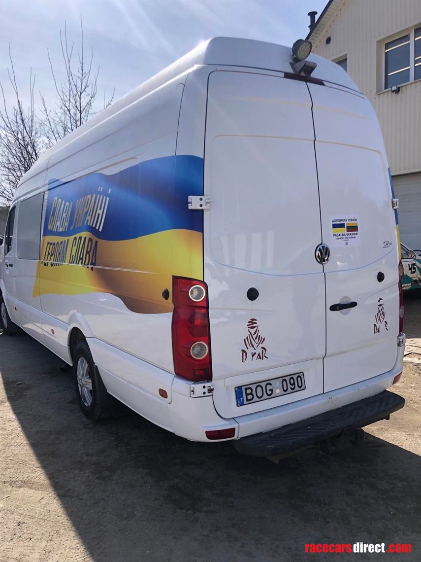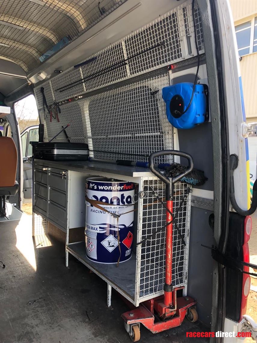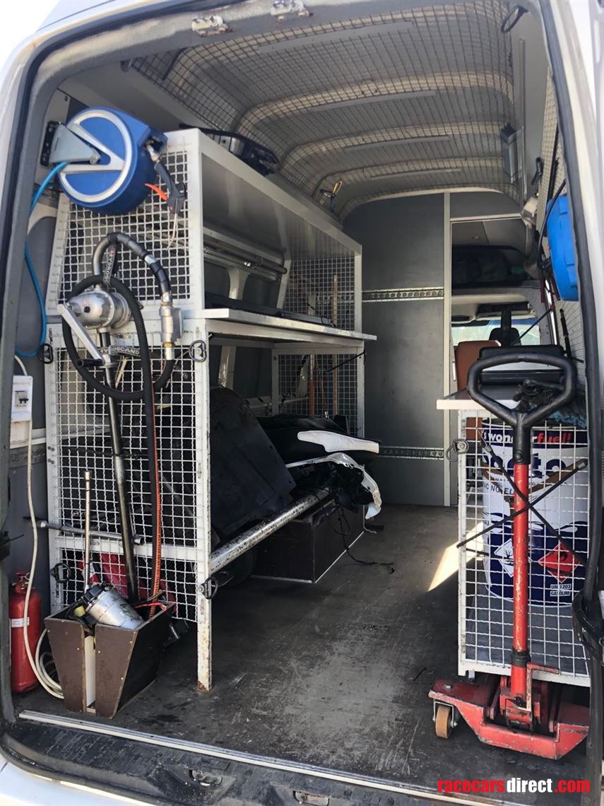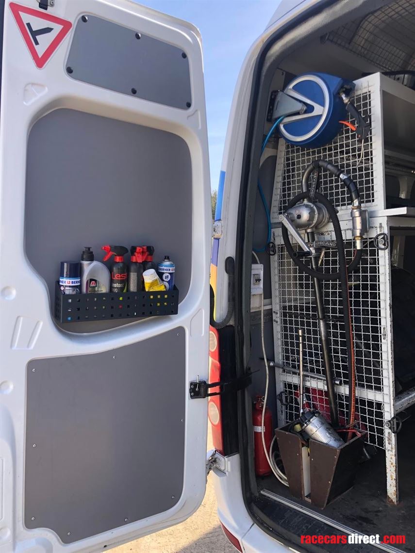 Volkswagen Crafter racing auxiliary van with towing hook, rear workbench has a shelf for storing tires, electricity is connected to power tools, air is supplied.