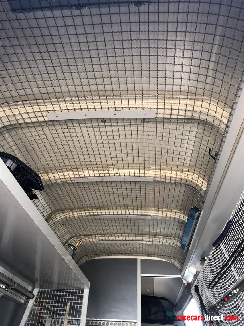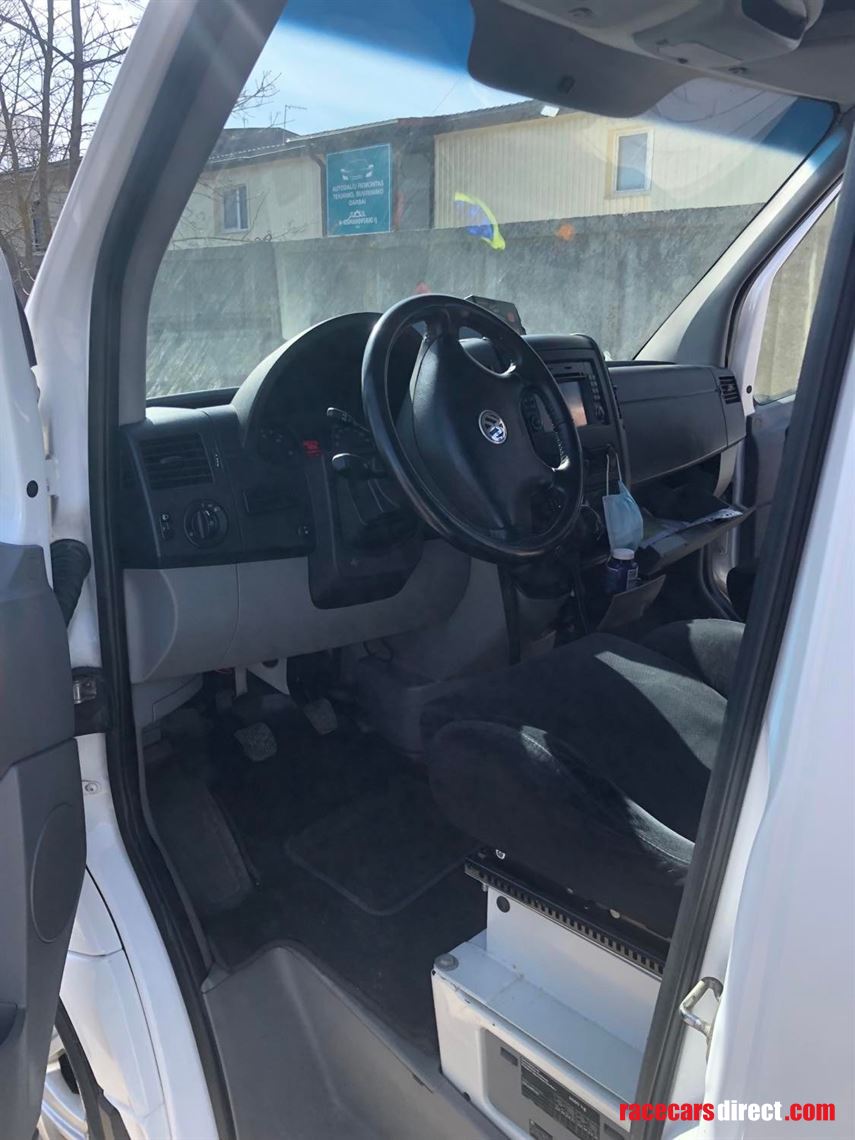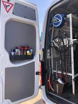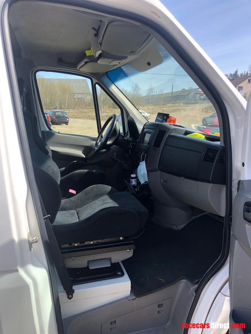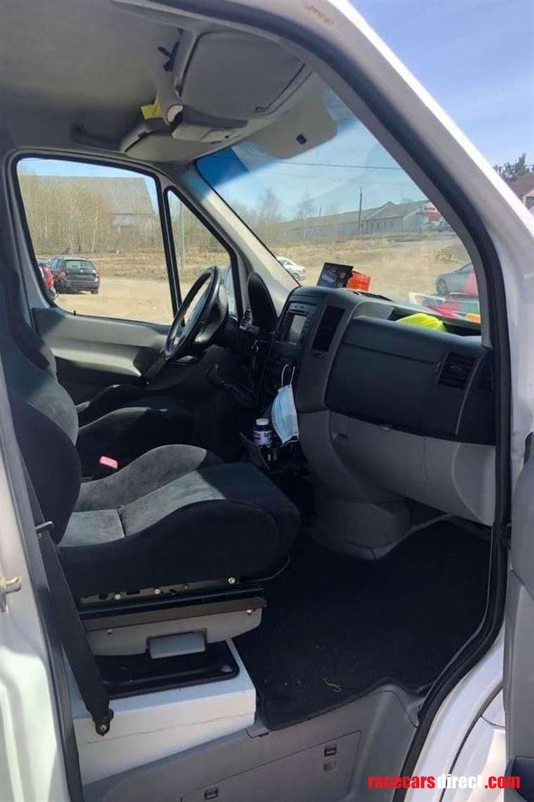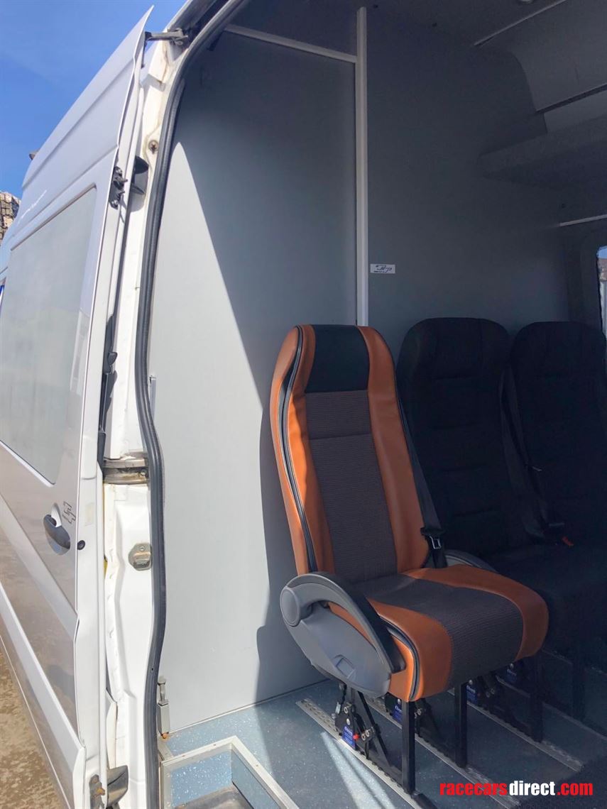 Volkswagen Crafter racing auxiliary van with towing hook, rear workbench has a shelf for storing tires, electricity is connected to power tools, air is supplied.