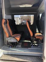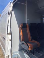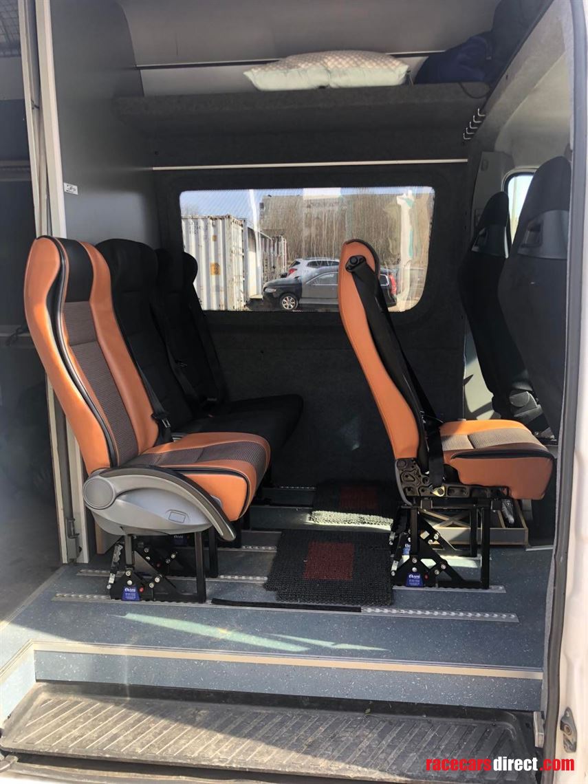 The documents have 6 seats, the front seats swivel and the rear room can be entered through the cabin. There is an inverter to 220v and space for a coffee machine.