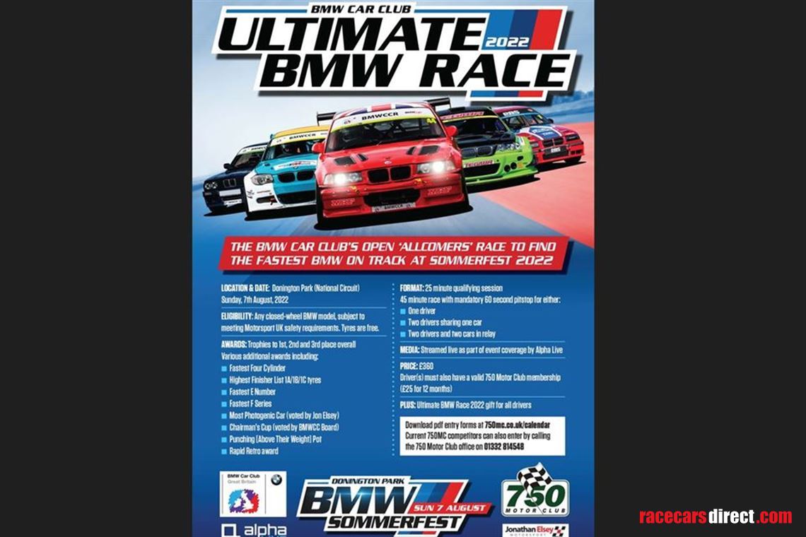 Alongside the BMW Car Club Racing Championship, 116 Trophy endurance series, 750 Motor Club's Donington Park meeting in August will host the BMW Car Club's huge Sommerfest event at the venue, as well as BMW Car Club's Ultimate BMW Race 2022 - for which any BMW race car is eligible, subject to meeting Motorsport UK safety requirements.