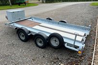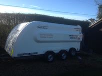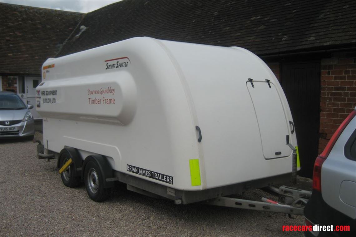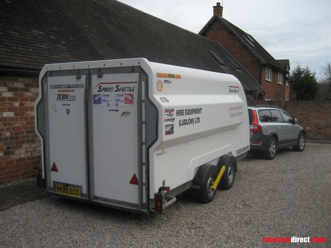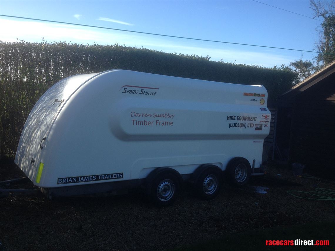 Brian James Sprint Shuttle trailer. Internal dimensions are 13'6"X6'. Comes complete with front opening door, 2 drop down rear doors, wheel rack, tool tray, spare wheel, winch,ratchet straps, locks. Recently serviced, new brake shoes etc, four good tyres. Stored under cover. Excellent condition.
