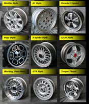 Designs include Minilite replica wheels, classic Porsche, Alpine and BMW wheels, Mercedes Aero style wheels, and many more. Available in sizes to suit specific models. Please see our website for the full range.