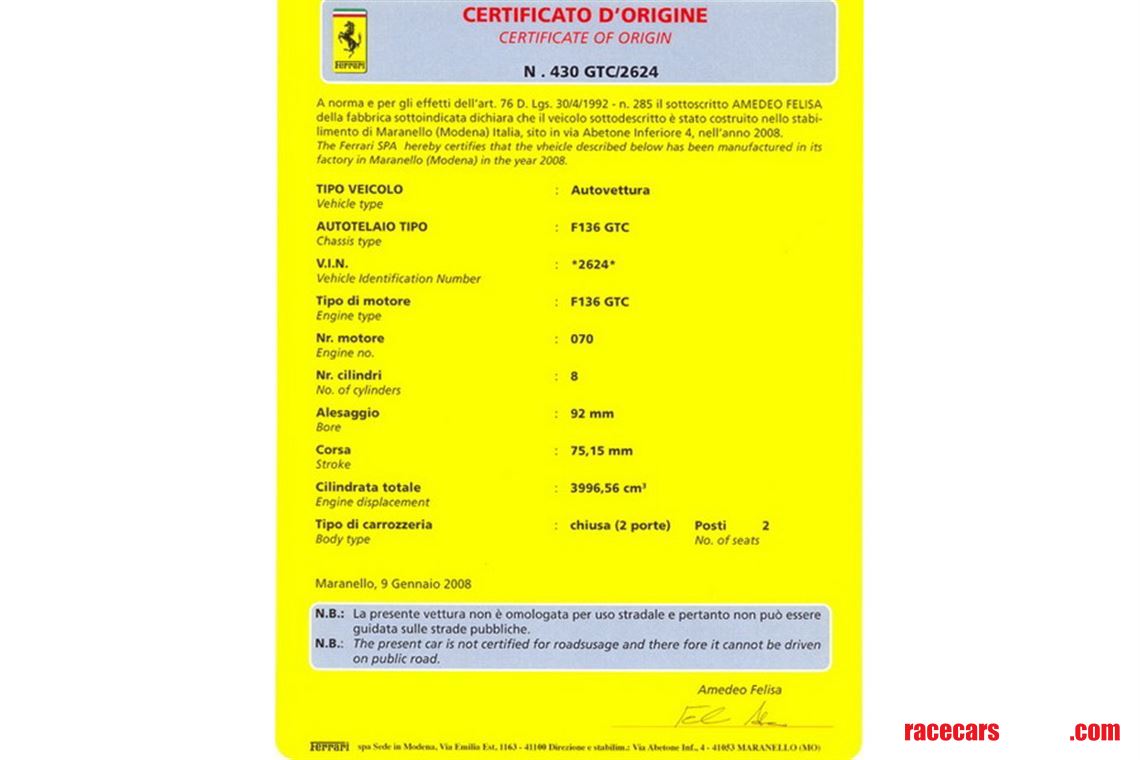 After it was retired from competition, AF Corse restored #2624, obtaining the coveted ‘Red Book’ Classiche certification in the process. #2624 also comes with a Ferrari Certificate of Origin. The engine and gearbox have been rebuild by Michelotto to the latest specification and have zero hours. The car is in stunning condition as restored and comes with 1 set of spare wheels. As part of the sale, #2624 will receive new a new fuel cell, crack testing, seat and belts so that is in 100% race-ready condition with nothing further to spend.