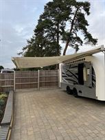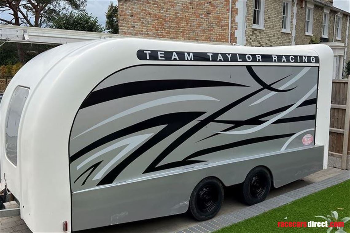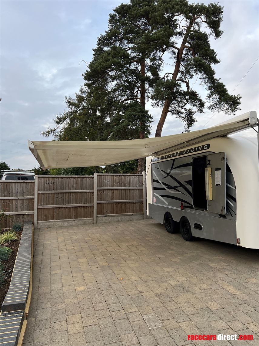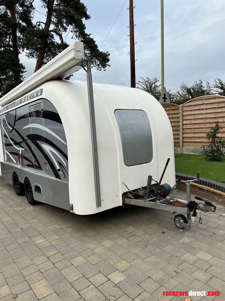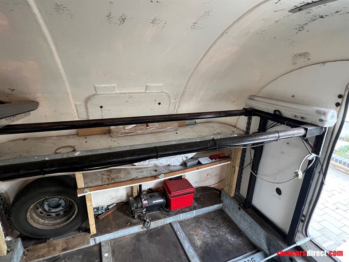 PRG enclosed hudraulic tilt trailer with electric winch, tyre rack, side door, drop down tailgate, spare wheel, internal storage compartment, Jerry can storage. Approx 12 years old with very little use. Trailer has purpose-built awning attached with side and front panels, including windows, added at a cost of £5,000.00. This trailer has not been used for 3 years and is surplus to requirements. This has been used for a mid-sized saloon car (wide bodied Golf, Seat). Private sale - no vat