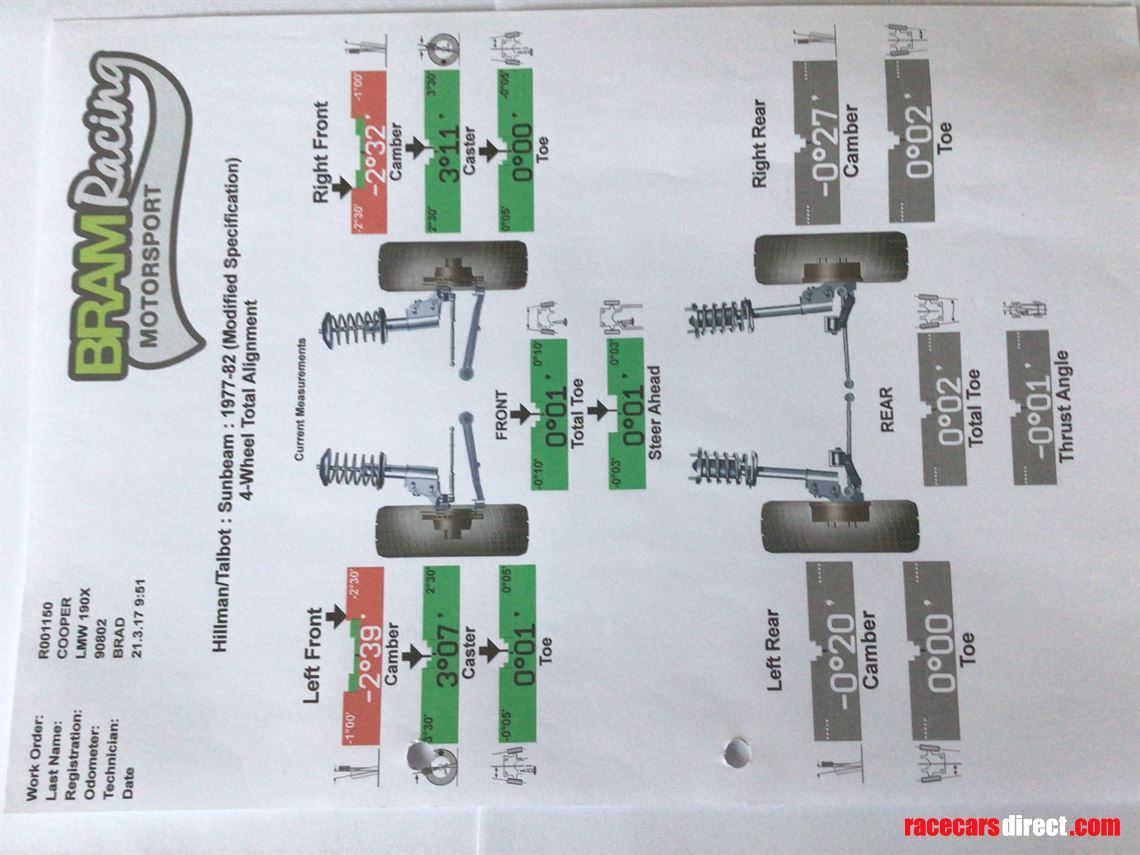 Car set up by 4 wheel alignment by Bram Racing motorsport showing near perfect alignment sheet included