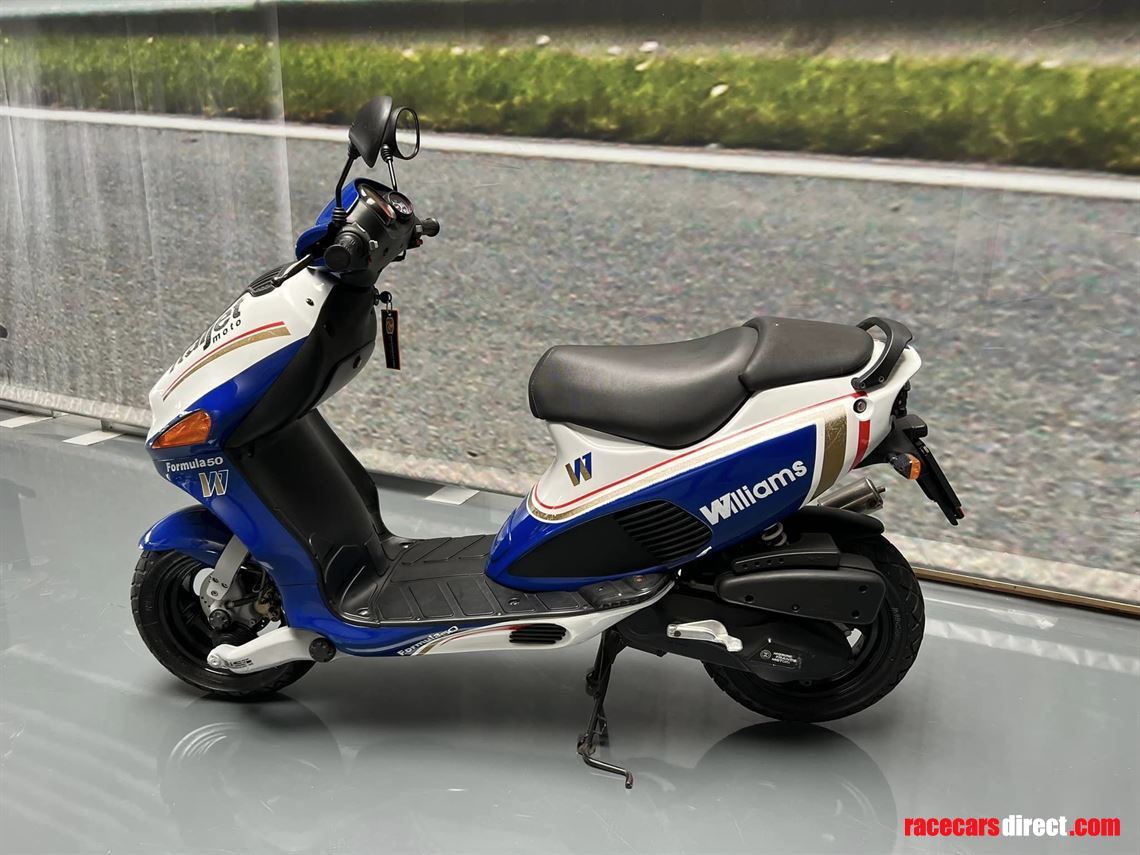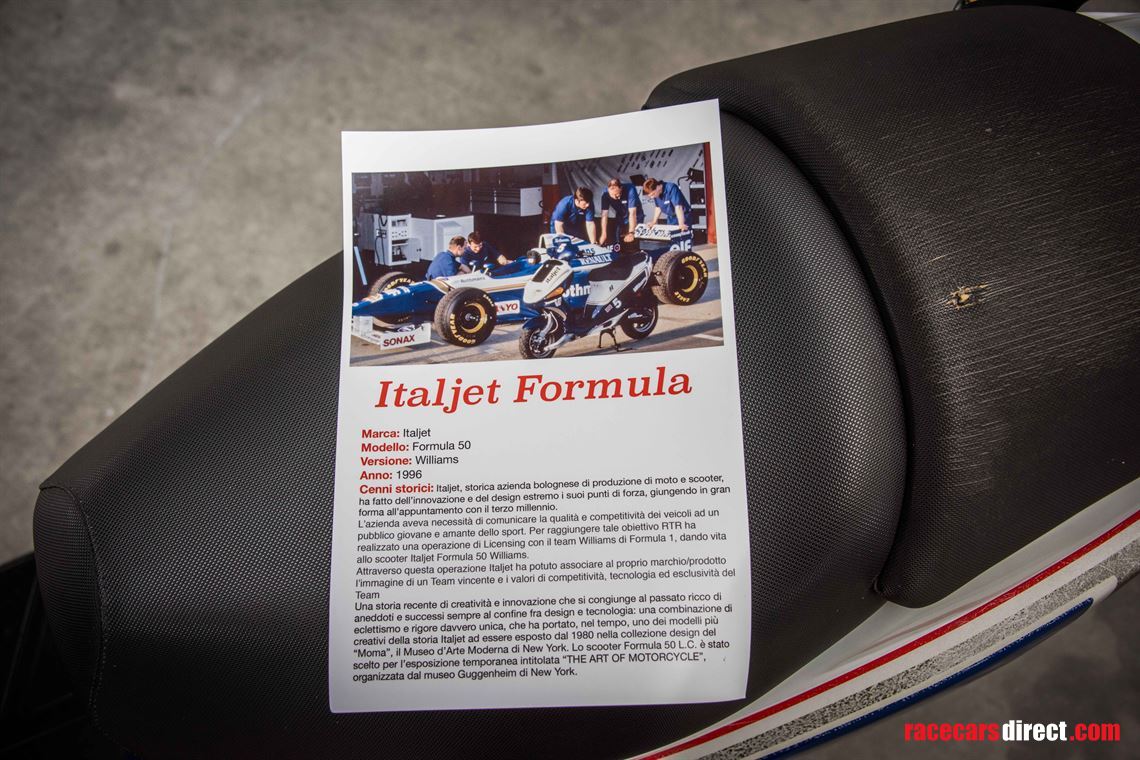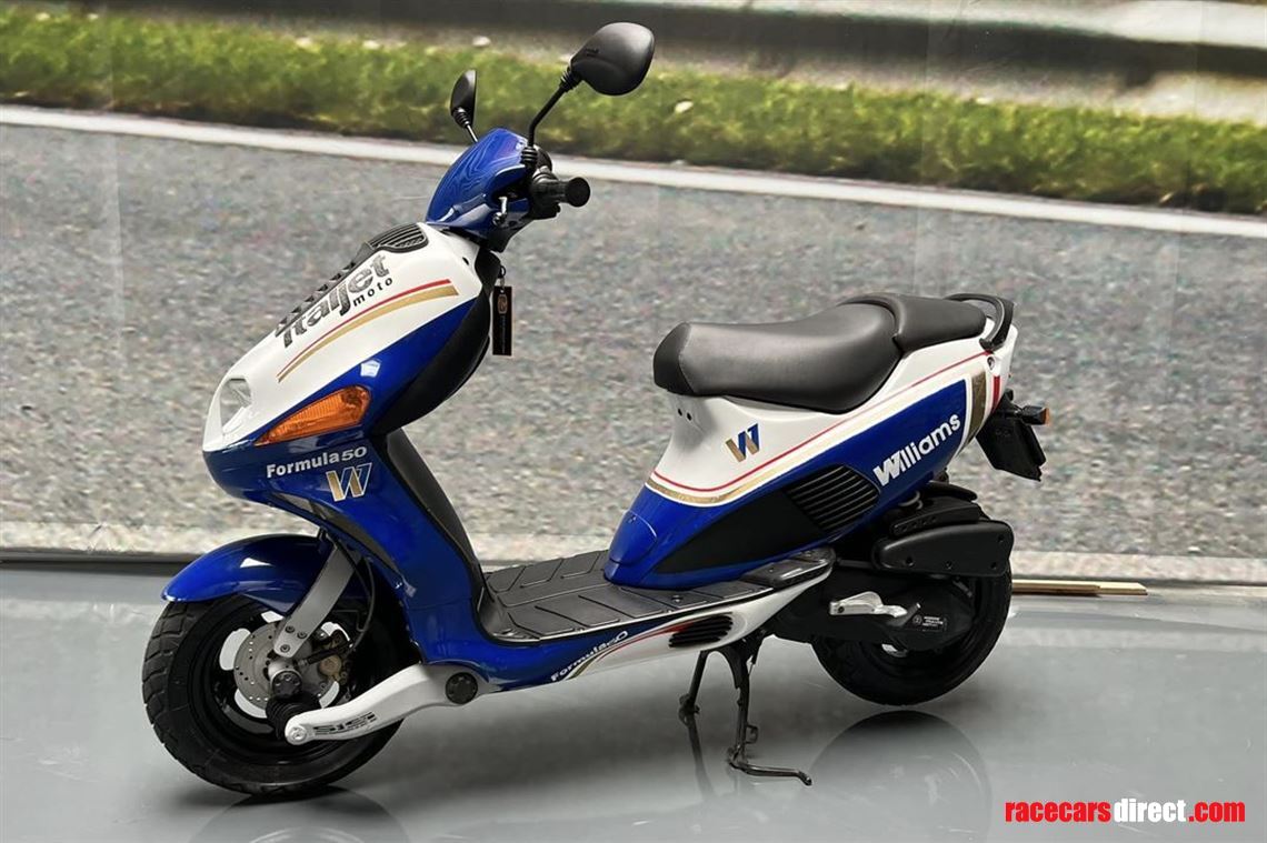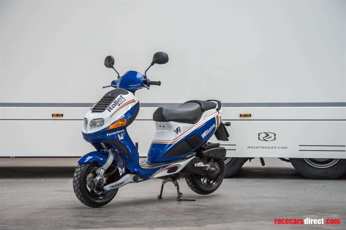 This scooter is an official Rothmans Williams Formula 1 Italjet 2 stroke team scooter, which was produced in limited edition with a total of only 500 units. The scooter was designed as a tribute to the Williams Formula 1 team that was sponsored by Rothmans in the past.