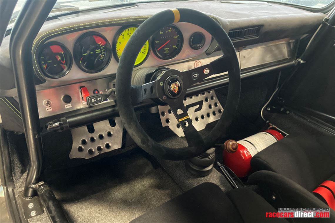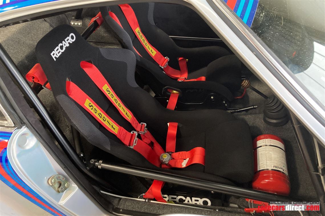 Inside is FIA specification safety: FIA Heigo full safety cage with removable door bars, FIA Recaro Profi SPG bucket seats and Sabelt 6-point harnesses. Quick release Momo Prototipo steering wheel, plus a 917 style wooden gear knob with quick shift gear mechanism for the 5 speed 915 with LSD.