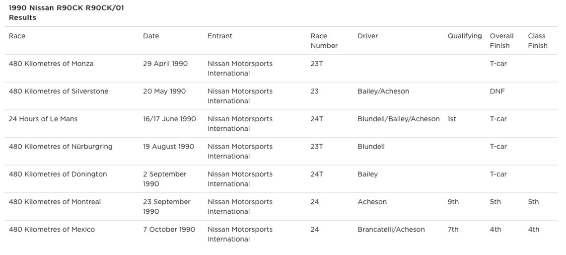 Believed to have been retained by the factory once its competition career drew to a close, and later put on display at the Le Mans Museum, chassis R90C/1 was purchased directly from Nismo by Group C Limited in August 2000. It was prepared in the United Kingdom prior to being entered in the HSR Classic Daytona 24 Hour, where it finished 3rd driven by Anders Olofsson. It was then sold to Henry Camferdam, who continued to campaign the car, after which it was purchased by respected historic racer, Aaron Hsu, from whom the vendor acquired it in 2010.