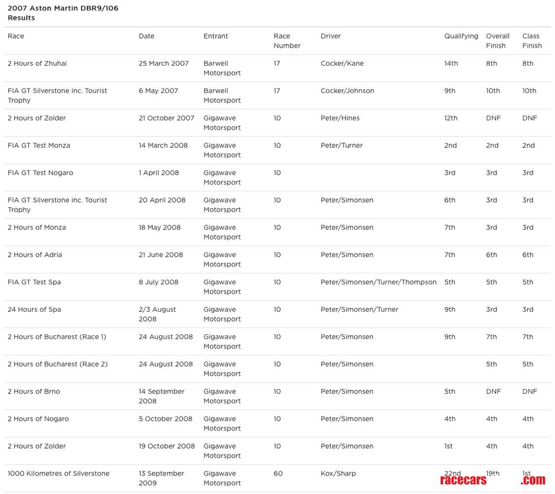For its 2008 campaign, Gigawave recruited experienced GT racers Philipp Peter and Allan Simonsen, a decision immediately vindicated by excellent 3rd places in the Silverstone Tourist Trophy and at Monza, further to 4th-place finishes at Nogaro and Zolder. At the 24 Hours of Spa in August, factory DBR9 driver Darren Turner joined the team. A richly-deserved 3rd place overall proved instrumental in Gigawave securing 4th place in the end-of-year team standings.