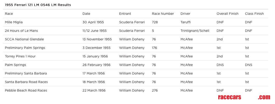 - Raced by Ferrari Works drivers Maurice Trintignant, Harry Schell, and Piero Taruffi