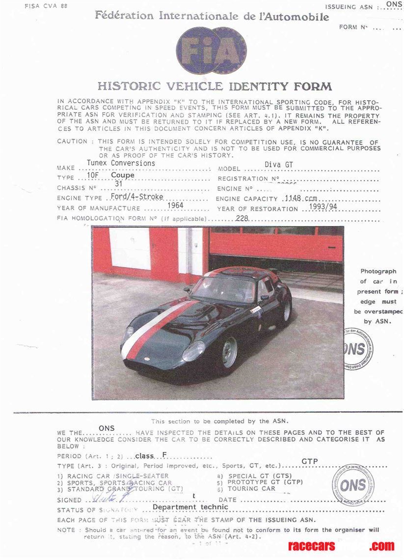 For sale is the racing car Diva GT, construction year 1964. There are only 9 vehicles worldwide. Complete history available included historic vehicle identity form. Completely restored and in unique condition. It`s in my pocession since 1998.