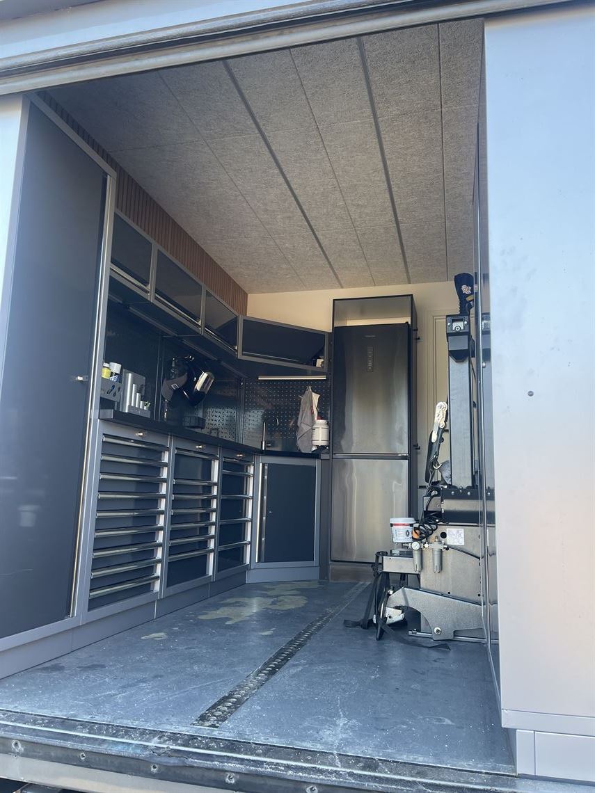 Workshop with 160 L petrol system with pump - tire machine - compressor - tool cabinets and cupboards for storage - sink
