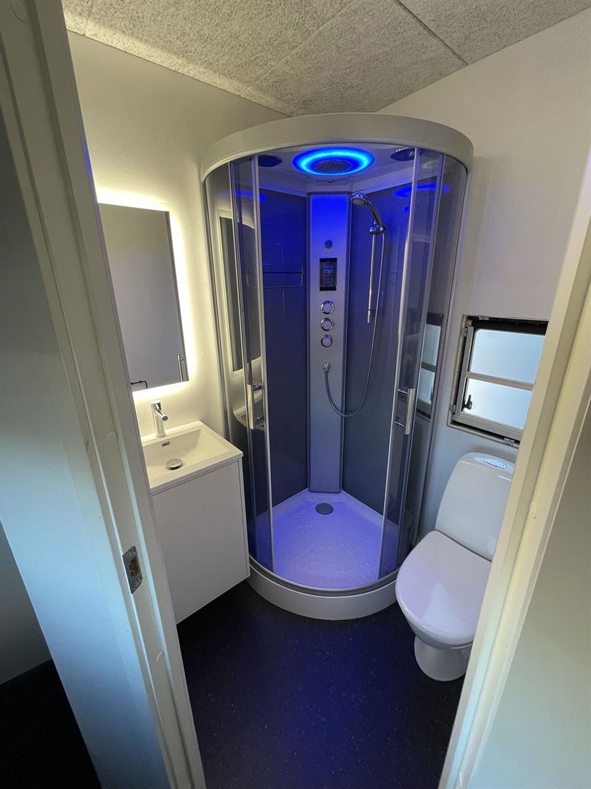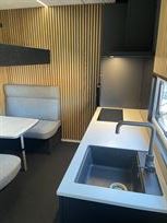 Living compartment with kitchen - refrigerator - hob - dishwasher - extractor hood - seating area - sleeping area for 4 people - toilet - shower - 900 L wastewater - 600 L fresh water - 60 L hot water tank - External water system - Electricity generator