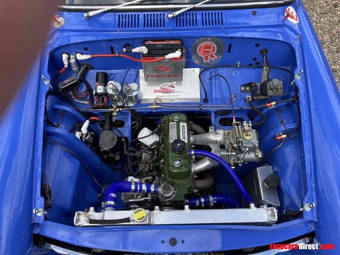 1293cc full race A+ block (Aldon Rolling Road report shows 120bhp @ 6450 rpm), 649 cam. 12G940, 11 stud, Cooper 'S' cylinder head, Weber 45 DCOE carb, Aldon Flame Thrower electronic ignition. Correct A40 competition Maniflow exhaust manifold + bespoke system which complies with noise limits at all circuits. SC/CR Spridget Gearbox & 4.5 ratio Salisbury type LSD both rebuilt by Hardy Engineering. Baffled Sump.