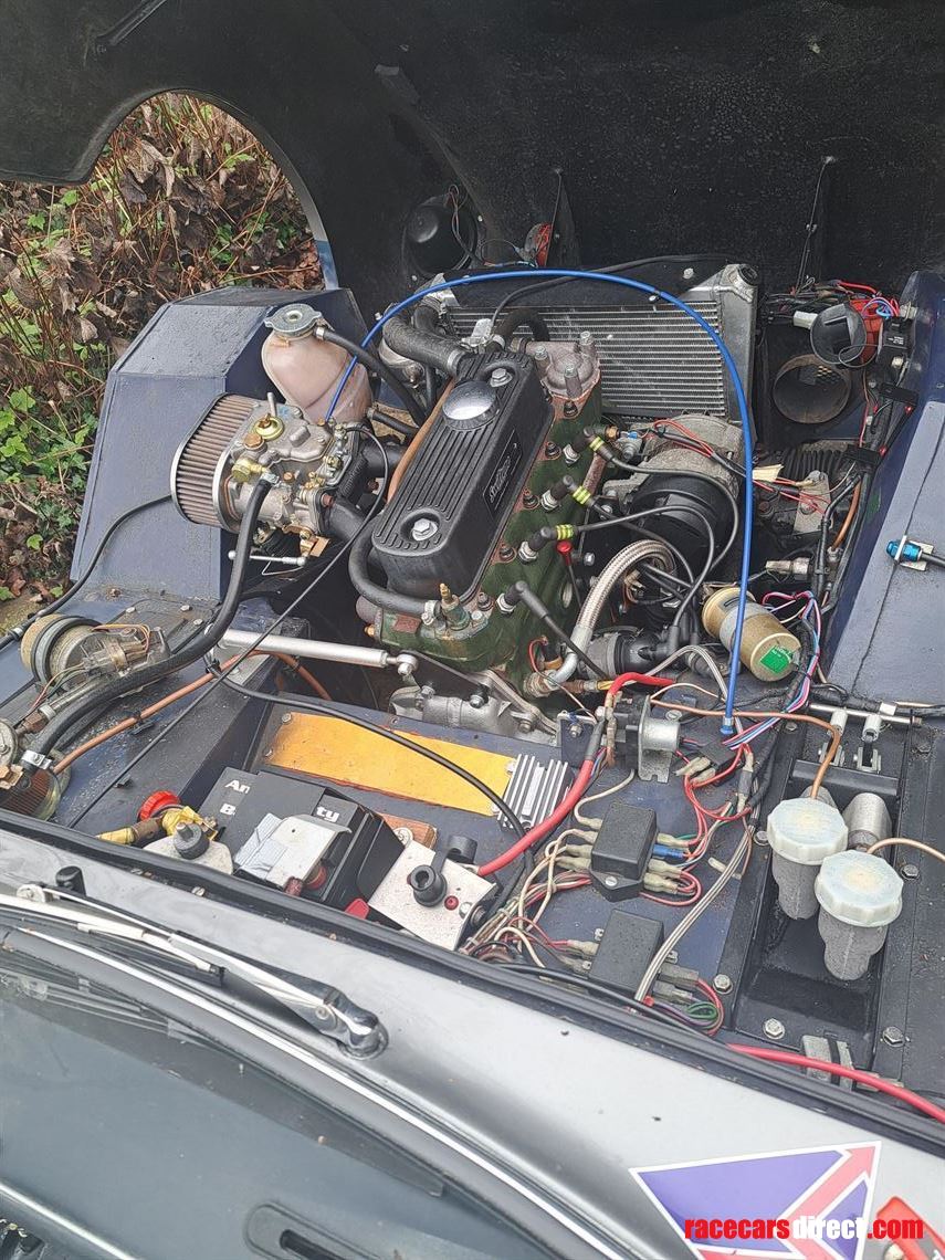 The suspension is upgraded with Peter May parts, including 500lb front springs, top link kit, negative camber kit, rear springs and telescopic rear shocks with rose jointed trailing arms. Numerous other weight saving mods.