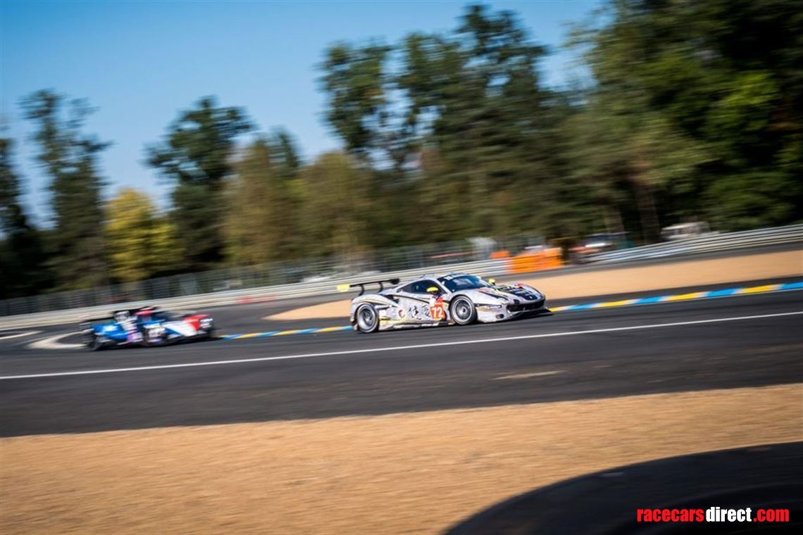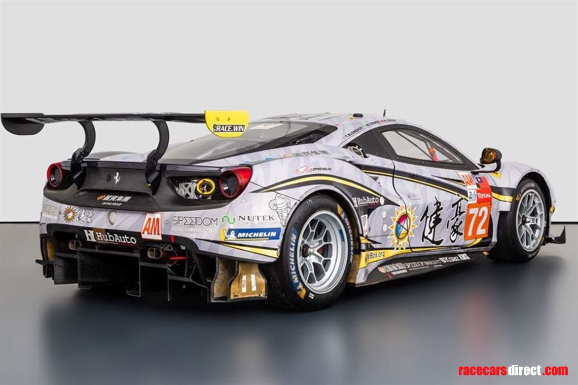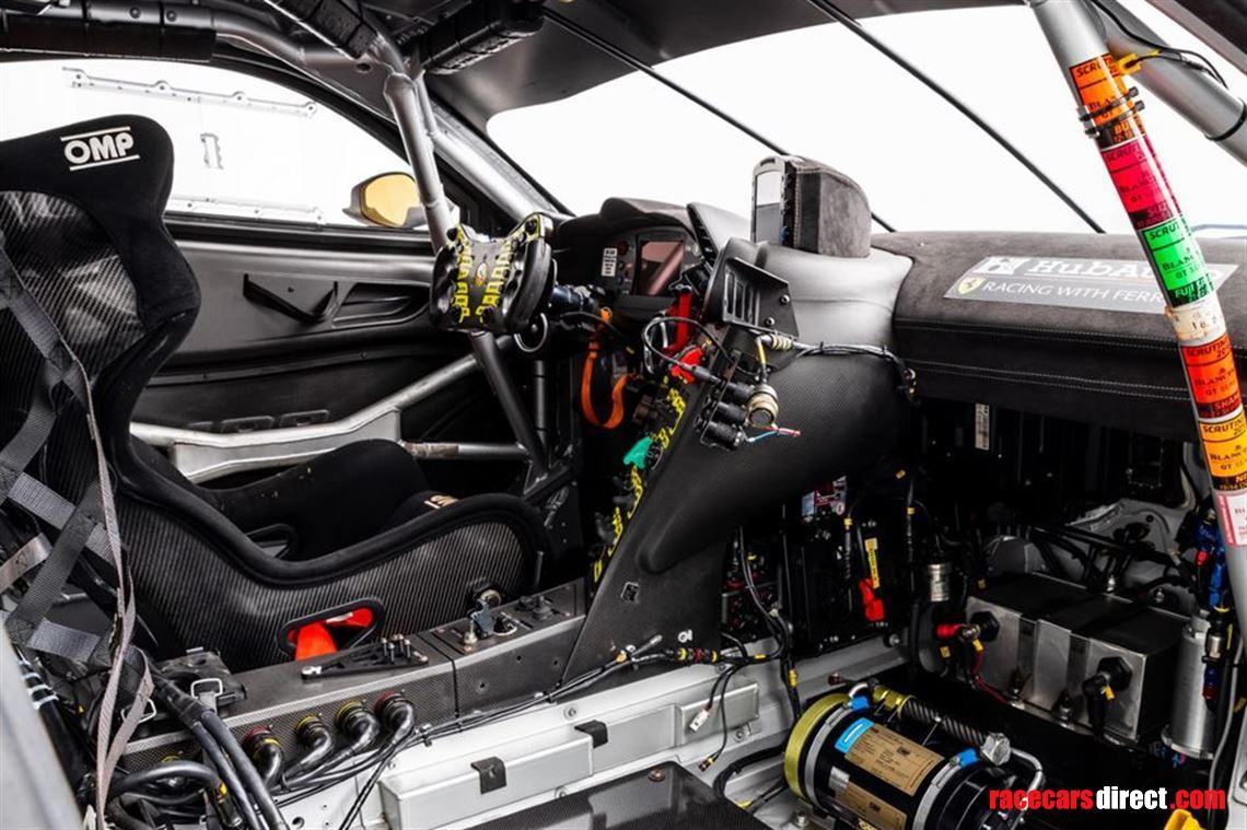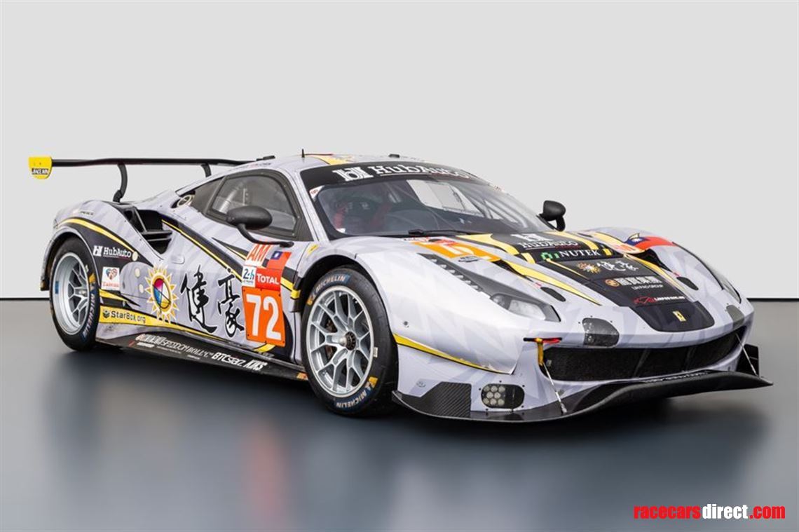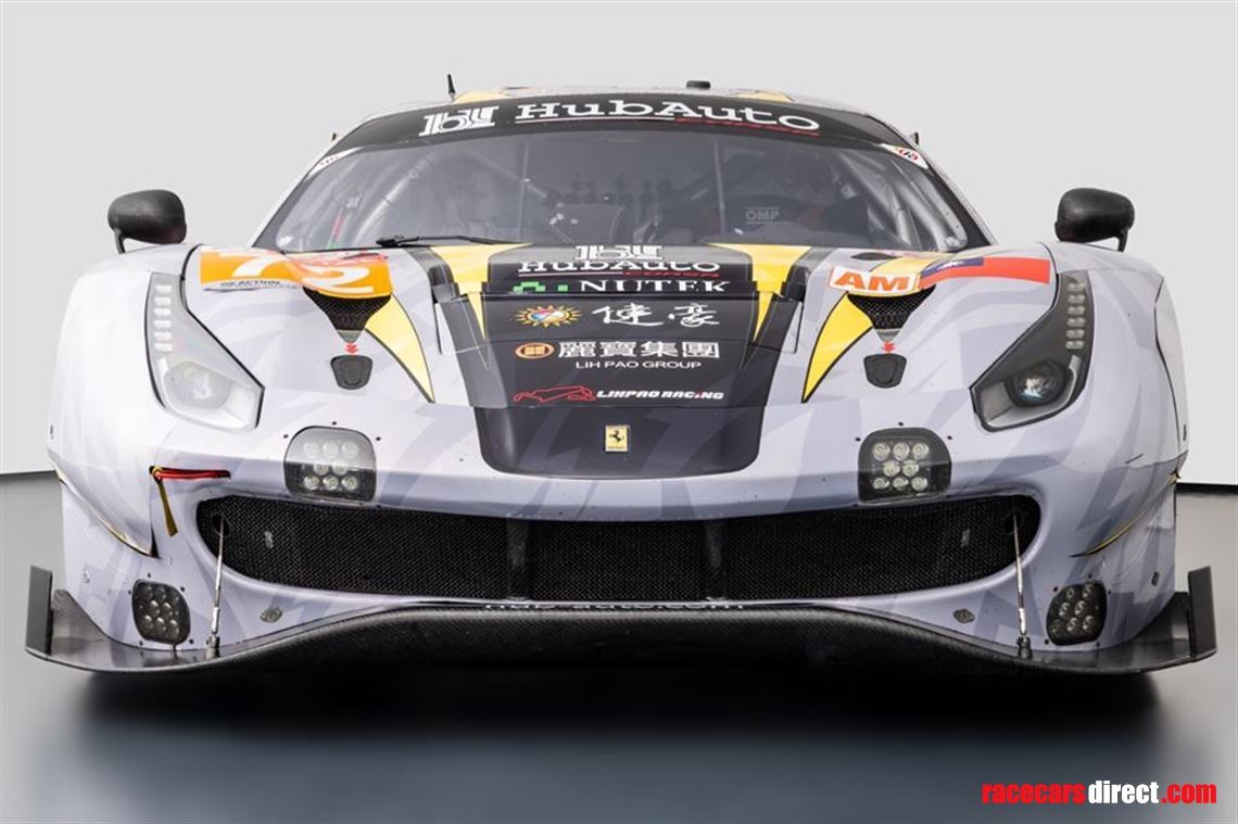 The offered vehicle has been converted to a 488 GTE 2019 EVO and specially optimized for long-distance races. It is equipped with five-way adjustable Multimatic dampers and features long-distance headlights, long-distance brakes, air conditioning, a driver helmet cooling system, cockpit lighting, a drinking system from Progressive Motorsport, a carbon fiber clutch, F1-style steel wheel nuts, Motec 4G telemetry, a rearview camera, a lithium battery, and a tire pressure and temperature monitoring system. It also offers a USB data recording and download system. The vehicle being offered here has an impressive history in various racing events, including: