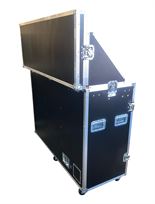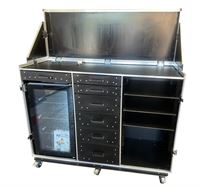 Hospitality flight case with fridge, storage, adjustable shelves & fold up lid.