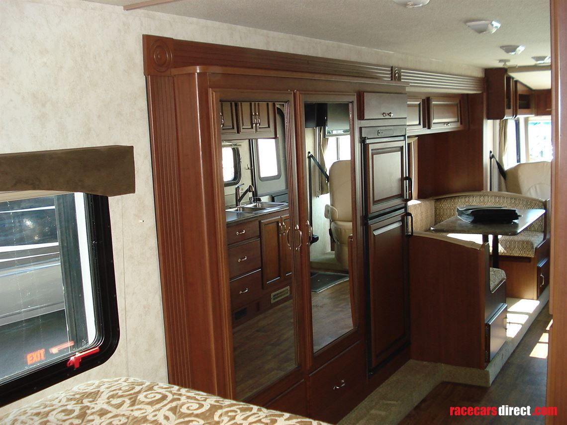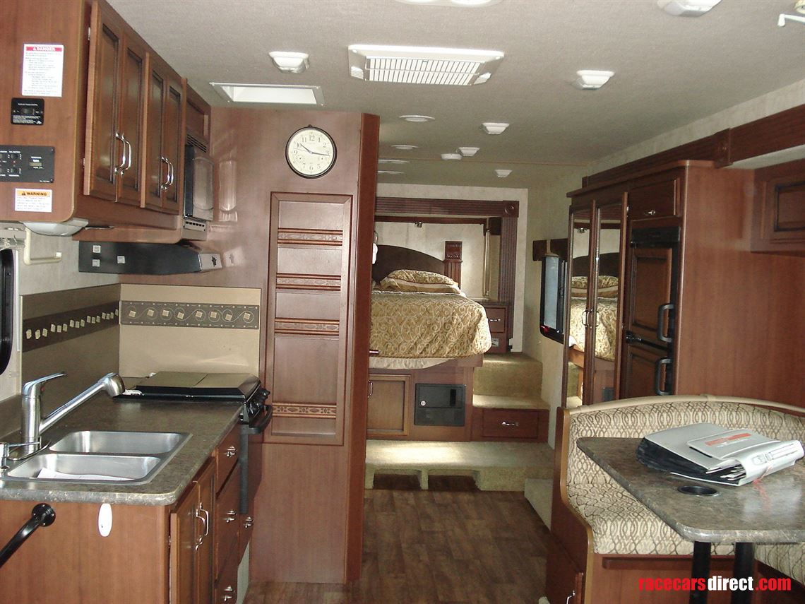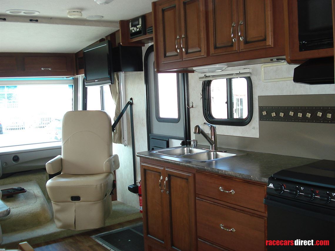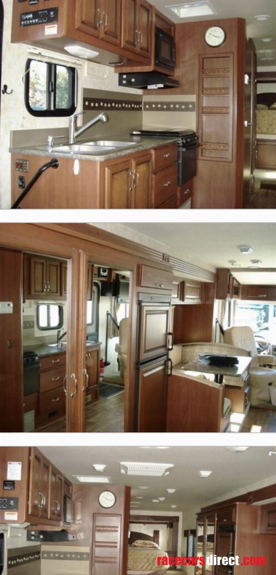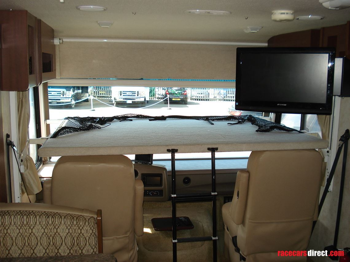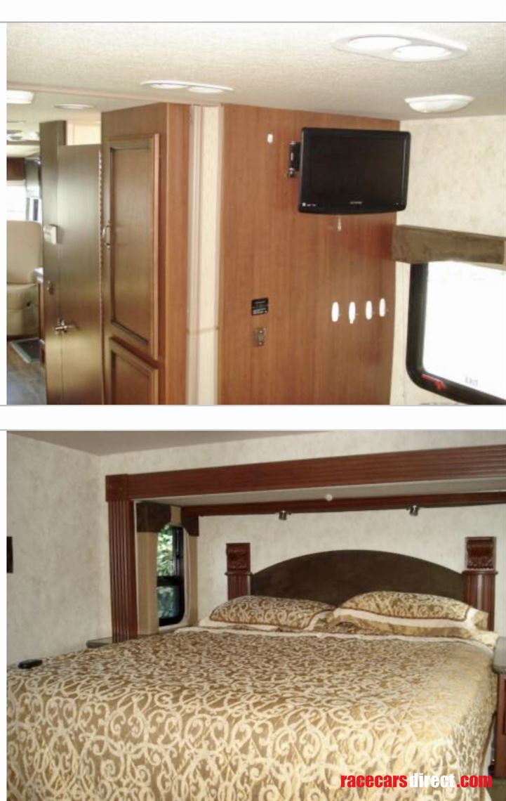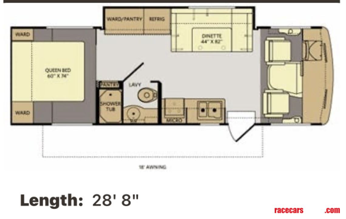 - This motorhome is clean and well taken care of. Low miles. Tires are new. 5 speed automatic transmission with overdrive. V10 motor. 80 gallon fuel tank. 5000lb towing capacity. 14 gallon propane tank. On board generator w/176.7 hours. 18' power awning. Auto power leveling jacks. Powered windshield shade. Queen Sleep Number mattress, bedroom TV, full wardrobe closet, sliding door to close off master bedroom. Powered two recliner sofa. Driver and passenger seats swivel for additional guest seating. Retractable TV in living area. 3 burner stove w/oven plus overhead microwave. Refrigerator is electric and propane. Heated hose for water hookup during cold weather travel. Extra power cord for extending shore power.