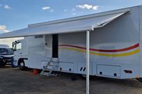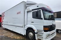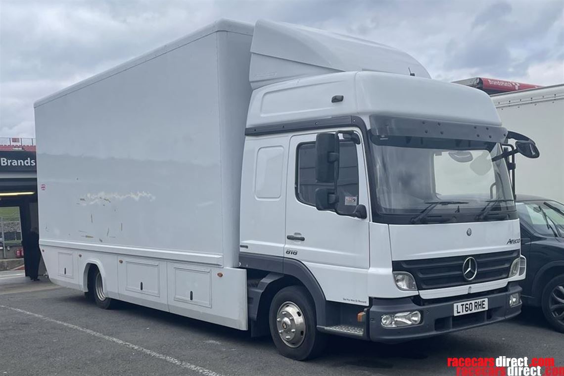 This is a very smart Mercedes Atego single-car race transporter with a sleeper cab, featuring a night heater. The current MOT has expired, but it has no advisories. It comes with new front tires and 450k km, and is fully serviced. It will be delivered complete with a fresh MOT.