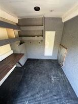 New carpeting covers the main space and there is a door which provides access to the garage area. The truck has a large worktop with carpeted shelving for storage of tools, spare and wheels etc. The floor is covered with rubber matting. Jet wash tank underneath, 2 leisure batteries and the 240 inverter.