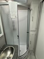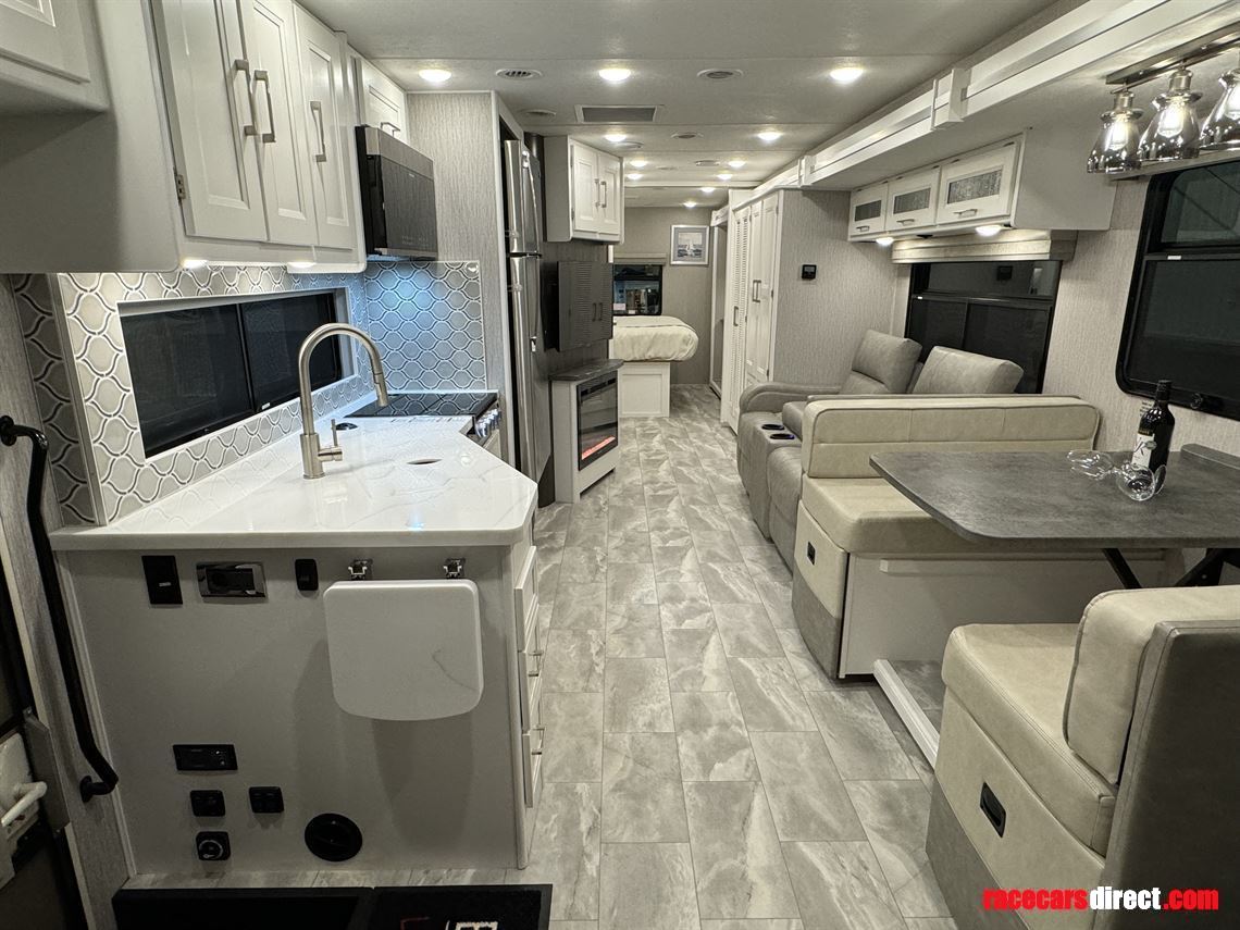 Here we have a beautiful as new Coachmen Encore 325SS with Caymus Full Body Paint, White Velvet Interior Wood Color, Powel Interior Decor, Full Wall slide-out, solar panels, illuminated awnings – 1 x 15′ and 1 x 10′, outside kitchen with fridge, outside TV, full-size domestic fridge freezer in the inside kitchen, washing machine & tumble dryer, rear fixed super-king size bed. drop down over-cab bunk bed, dinette also converts into a bed, Reclining/massaging cinema seating. Full size shower and porcelain toilet. Converted to run on LPG dual fuel. Alcoa Alloy Wheels with 255 x 22.5 Michelin tyres. Just 2,500 miles only! Available to view at our Somerset showroom.