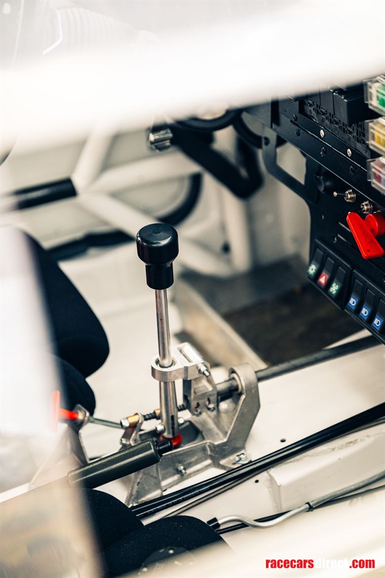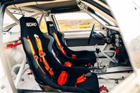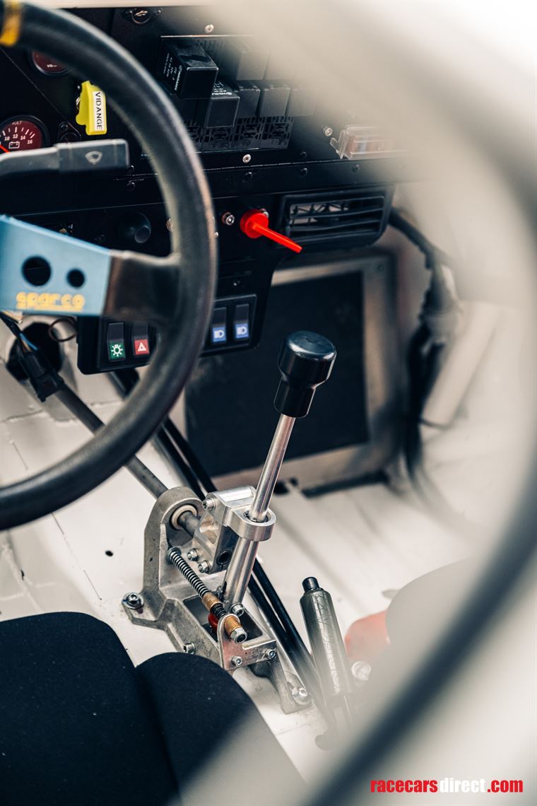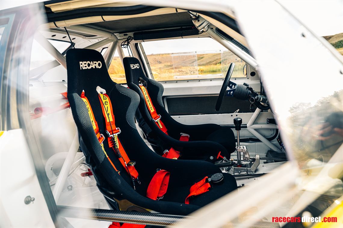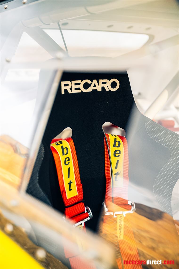 - The specification includes VDO dials, drilled pedals, a fire extinguisher, a white roll cage, a Sparco steering wheel, and two black Recaro bucket seats with red Sabelt harnesses.